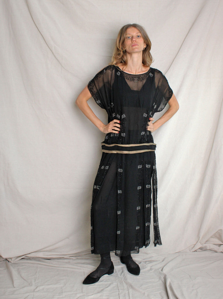 20s Drop Waist Beaded Silk Chiffon Dress